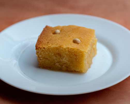 Dulce de sémola, yoghurt y almendras, remojado en almíbar